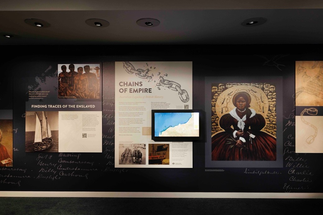An exhibition titled Chains of Empire and based on the project team’s research was hosted by the Australian National Maritime Museum between August 2025- July 2025. It was based on project research as well as research assistant/ curator Isabel Smith’s research under the oversight of CI Paul Arthur. The exhibition comprised a wall display as well as two interactive installations: a Q&A screen hub designed to test visitors’ understanding of slavery and its legacies; and a mapping screen presenting data which had been visualised by the TLC project.