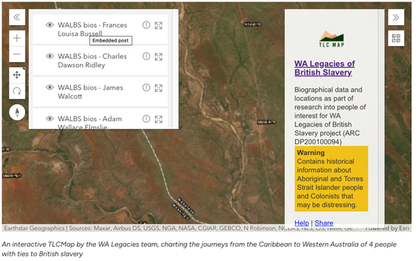 TLCMap also allows people, objects and events to be plotted on maps. This enabled the WA Legacies team to visualise the flow of British colonisers from the Caribbean to Australia. Using TLCMap, charted the journeys of Walcott, Ridley and several other British colonisers who left the Caribbean for Western Australia. Drawing on the WA Legacies team’s biographical research, they were able to plot and timestamp every stop the colonisers made with annotations detailing their ties to slavery and their activities at each location. They then stacked the maps together using TLCMap’s multilayer function to compare the colonisers’ movement.